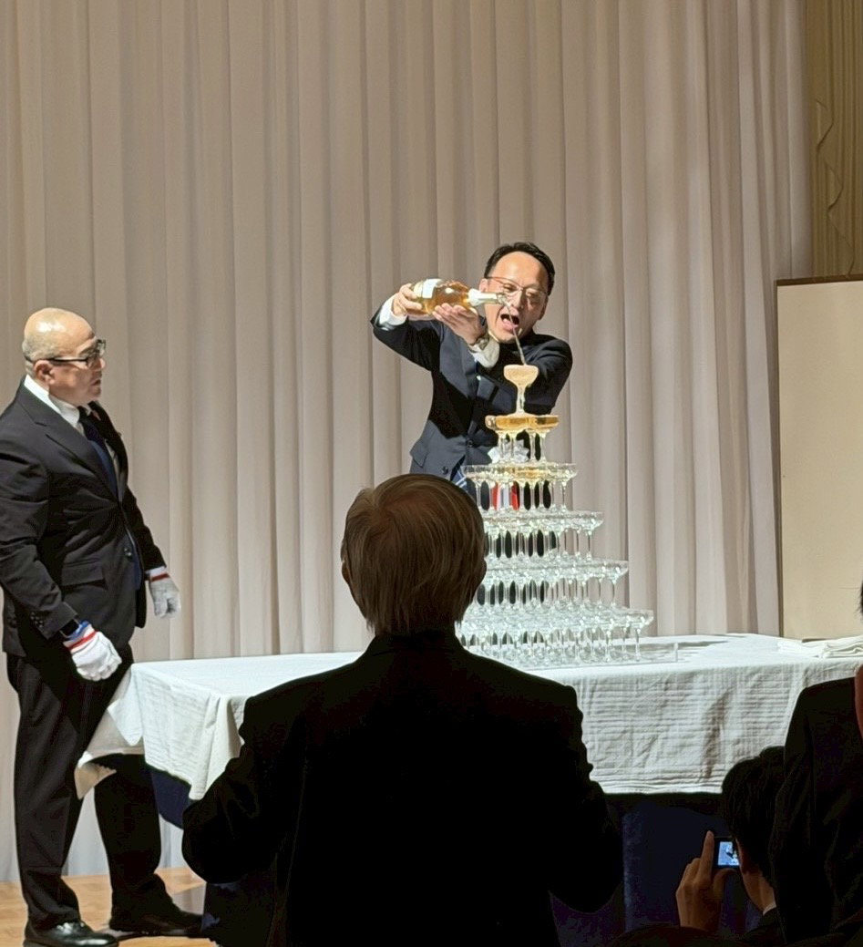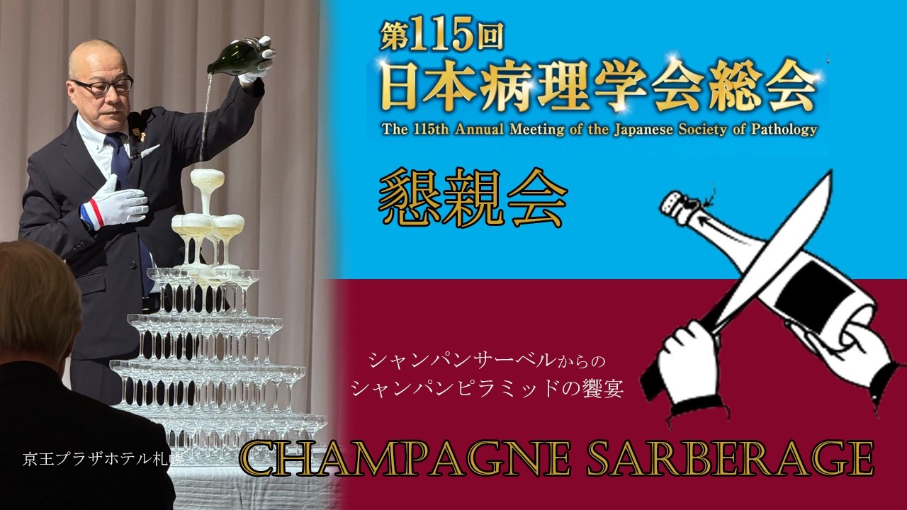 演出面においては、当社代表 中村雅人によるシャンパンサーベラージュおよびシャンパンピラミッドが披露され、来場者の皆様から大きな拍手を頂戴いたしました。なお、中村の子息は北海道大学医学部医学科に在籍しており、本総会の大会会長である田中伸哉教授の講義を受講するなど、日頃より大変お世話になっております。