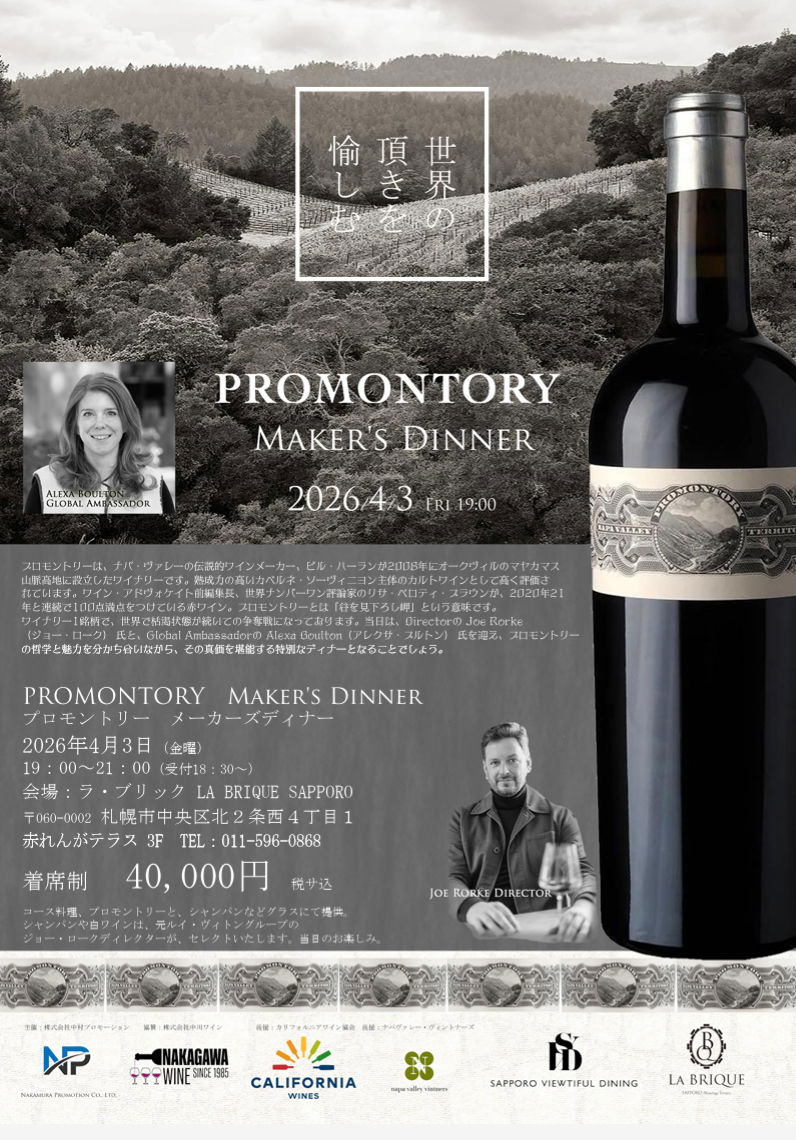 株式会社中村プロモーション(本社:北海道札幌市、代表:中村雅人)は、ナパ・ヴァレーを代表するカルトワイン PROMONTORY(プロモントリー) のメーカーズディナーを、2026年4月3日(金)、札幌・赤れんがテラス「ラ・ブリック」にて開催いたします。本イベントは、北海道では初開催となります。