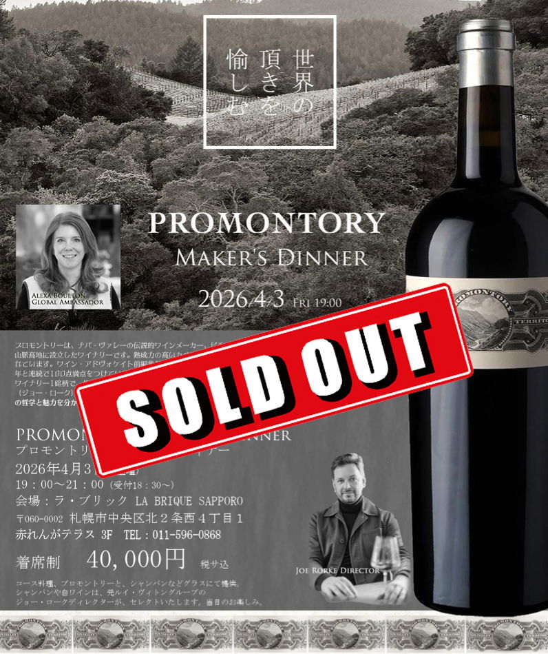 日時:2026年4月3日(金)19:00~21:00(受付18:30~) 会場:ラ・ブリック / LA BRIQUE SAPPORO(赤れんがテラス3F) 形式:着席制メーカーズディナー 内容:コース料理、PROMONTORY、シャンパーニュほか(グラス提供) 参加費:40,000円(税込・サービス料込) 主催:株式会社中村プロモーション協賛:株式会社中川ワイン(NAKAGAWA WINE CO., LTD.) 後援:カリフォルニアワイン協会(CWI)、ナパヴァレー・ヴィントナーズ(NVV) ※PROMONTORY 当日のワインボトル販売について 当日のワインボトル販売は、酒類小売業免許を有する 株式会社中村プロモーション が行います。 各ヴィンテージにつき、お一人様1本限りのご購入とさせていただきます。 なお、転売目的でのご購入は固くお断りいたします。